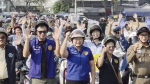 สุพรรณบุรี นายอำเภอสาวนั่งซาเล้งลงเนินไปแจกหมวกนิรภัยรณรงค์ขับขี่ปลอดภัย