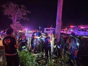 รถทัวร์เสียหลักลงร่องน้ำกลางถนนชนกับต้นไม้เบื้องต้นผู้โดยสารเสียชีวิต 8 ราย บาดเจ็บ หลายรายราย เจ้าหน้าที่เร่งนำส่งโรงพยาบาลไชยา และโรงพยาบาลใกล้เคียง