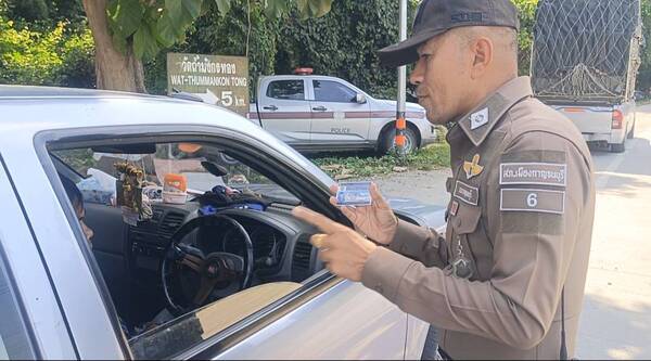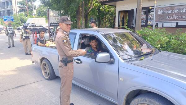 กลางวันแดดเชือดผิว เวลา 12.00 น. วันที่ 15 พ.ย. 2568 เจ้าหน้าที่ตำรวจ สภ.เมืองกาญจนบุรี ตั้งด่านบนถนนสายกาญจนบุรี–ด่านมะขามเตี้ย หน้าจุดตรวจแม่กลอง ตามคำสั่งกวดขันวินัยจราจรและสกัดการลักลอบขนแรงงานและสิ่งผิดกฎหมาย