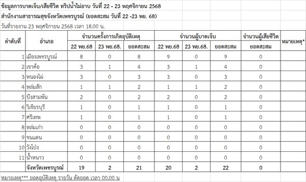 ด้านสถานการณ์อุบัติเหตุที่เกี่ยวข้องกับกิจกรรม “ทริปน้ำไม่อาบ” ระหว่างวันที่ 22–23 พฤศจิกายน 2568 พบเกิดเหตุ 21 ครั้ง ผู้บาดเจ็บ 22 คน ไม่มีผู้เสียชีวิต แยกเป็น