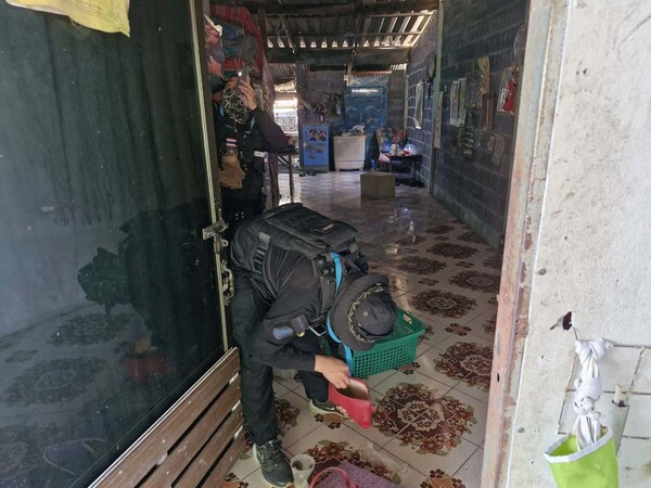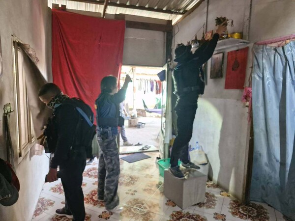 จุดแรก เจ้าหน้าที่ปิดล้อมตรวจค้นบ้านหลังหนึ่งในซอยคำภูเงิน พบ นายวรวิทย์ จันทิมพ์ อายุ 38 ปี อยู่ในบ้าน ก่อนเข้าตรวจค้นอย่างเปิดเผย ผลการตรวจค้นพบ ยาบ้า 139 เม็ด บรรจุในถุงพลาสติกใส 3 ถุง วางอยู่บนแท่นพระบริเวณประตูทางเข้าบ้าน เจ้าหน้าที่จึงควบคุมตัวพร้อมของกลางไปยัง บก.ร้อย.ฉก.ทพ.2105 เพื่อสอบสวนขยายผล