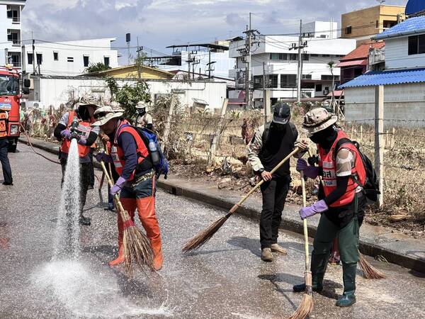 ชุดที่ 1 ประกอบด้วยกำลังพล อส. จำนวน 36 นาย ปฏิบัติหน้าที่ร่วมกับ ปภ.จังหวัดสุพรรณบุรี และร้อย.อส.จ.หนองบัวลำภู มุ่งเคลียร์เส้นทางการจราจร เก็บกวาดสิ่งของเครื่องใช้ที่พังเสียหายในพื้นที่รับผิดชอบบริเวณ ซอย 2 เทศาพัฒนา เพื่อให้สัญจรได้ตามปกติอีกครั้ง