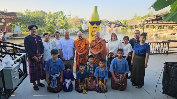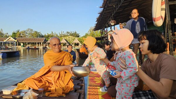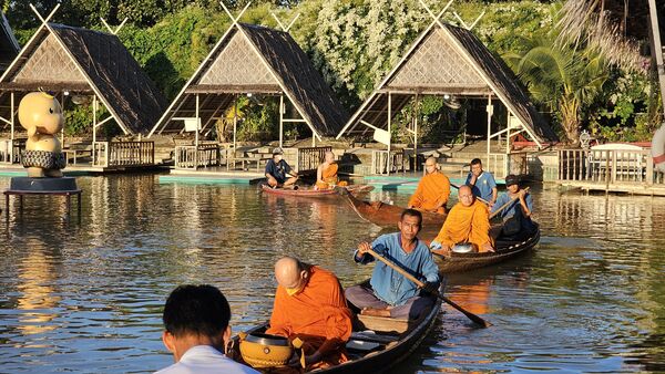 ที่ท่าน้ำสวนกล้วยสุพรรณบุรี หลังวัดป่าเลไลยก์วรวิหาร อำเภอเมือง จังหวัดสุพรรณบุรี บรรยากาศท่องเที่ยวสุดคึกคัก นักท่องเที่ยวแต่งชุดไทยร่วมตักบาตรทางน้ำ “นาวาภิกขาจาร” ย้อนวิถีไทยแบบดั้งเดิม ทุกเช้าวันเสาร์–อาทิตย์ พร้อมชมการแสดงดนตรีและศิลปวัฒนธรรมโดยนักเรียนจิตอาสา