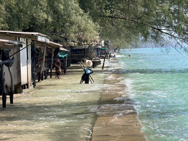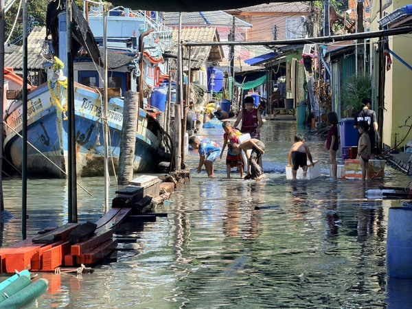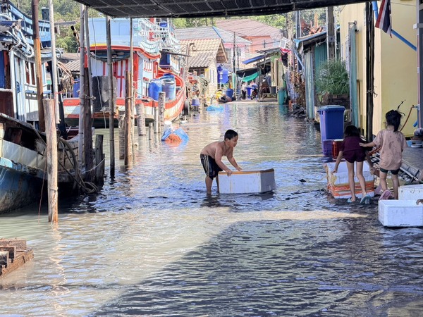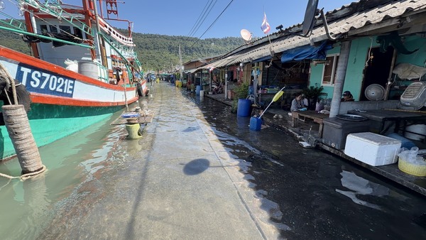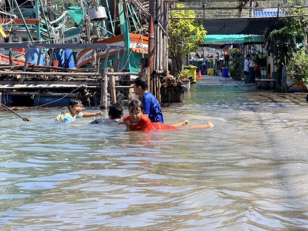 อ.คลองใหญ่ จ.ตราด / เวลา 11.00 น. วันที่ 7 ธันวาคม 2568 ผู้สื่อข่าวลงพื้นที่ติดตามสถานการณ์น้ำทะเลหนุนที่บ้านคลองมะขาม ต.หาดเล็ก อ.คลองใหญ่ จ.ตราด หมู่บ้านที่ตั้งอยู่บนน้ำกว่า 100 หลังคาเรือน พบว่าน้ำทะเลเอ่อท่วมถนนและสะพานริมคลองซึ่งเป็นเส้นทางสัญจรเข้า–ออกของชุมชน ประชาชนยังคงใช้ชีวิตตามปกติ ขณะที่เด็ก ๆ ในหมู่บ้านออกมาเล่นน้ำอย่างสนุกสนาน