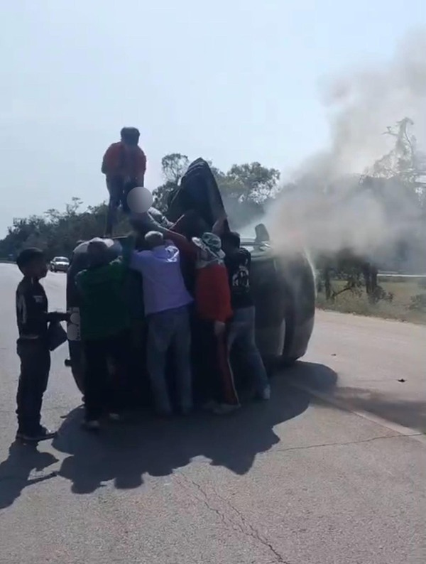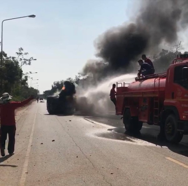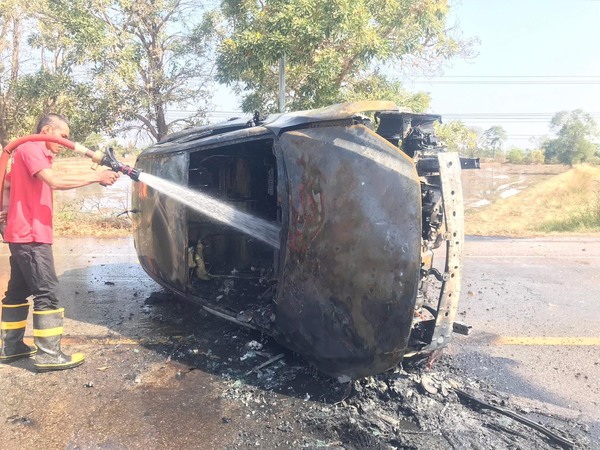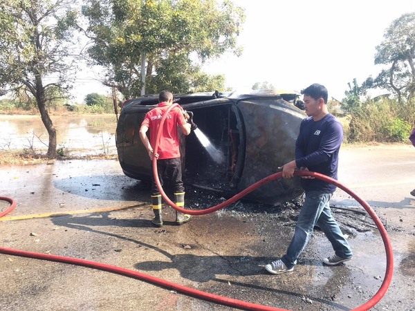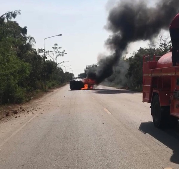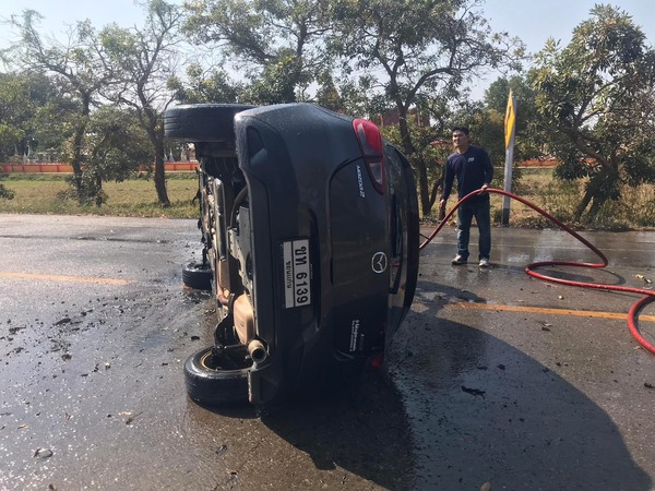 ที่เกิดเหตุพบรถเก๋งมาสด้า 2 ทะเบียนขอนแก่น พลิกตะแคงกลางถนน มีควันพวยพุ่งจากห้องเครื่อง พลเมืองดีและเจ้าหน้าที่กู้ภัยรีบเข้าช่วยเหลือนำหญิงคนขับออกจากรถได้อย่างปลอดภัย ก่อนเกิดไฟลุกไหม้บริเวณด้านหน้ารถอย่างรุนแรง
