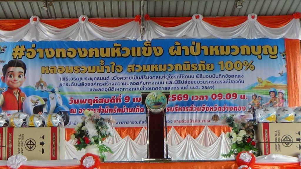 ทั้งยังได้รับการสนับสนุนจากหมวกกันน็อกจากบริษัท กลางคุ้มครองผู้ประสบภัยจากรถ จำกัด และบริษัท ฮอนด้า ฯ รวมอีกกว่าพันใบ เพื่อมอบให้แก่ชาวอ่างทอง ทุกหน่วยงานยังได้รับมอบบันทึกข้อตกลงความร่วมมือ (MOU) เพื่อขับเคลื่อนความปลอดภัยจังหวัดอ่างทองอย่างยั่งยืนด้วย