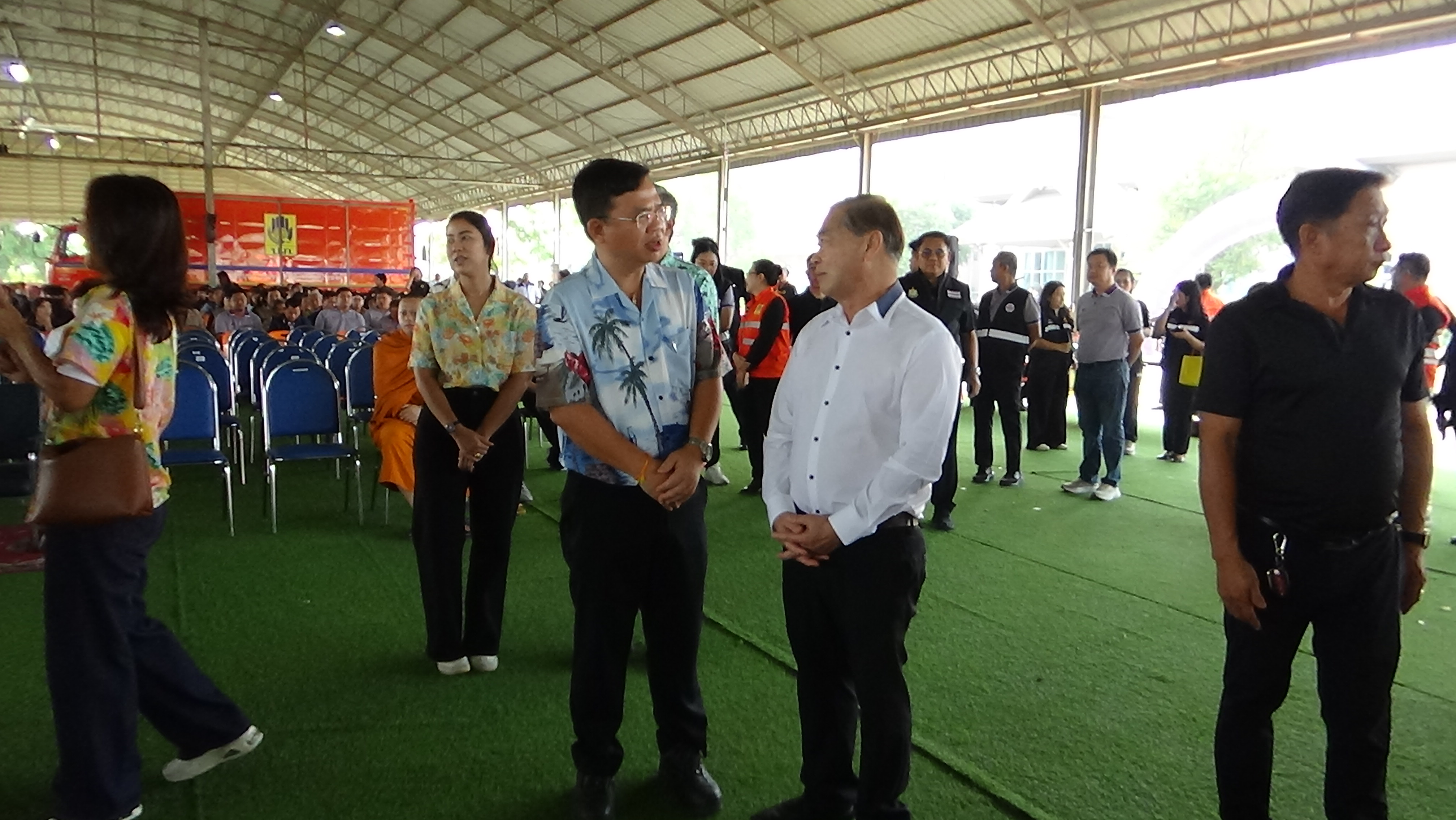 โดยมี นายสมศักดิ์ ปริศนานันทกุล อดีตรัฐมนตรีว่าการกระทรวงเกษตรและสหกรณ์ นายนที มนตริวัต ผู้ว่าราชการจังหวัดอ่างทอง นายไพบูลย์ ศุภบุญ รองผู้ว่าราชการจังหวัดอ่างทอง น.ส.สุกัญญา กุลสุวรรณ์ ปลัดจังหวัดอ่างทอง หัวหน้าสำนักงานป้องกันและบรรเทาสาธารณภัยจังหวัดอ่างทอง หัวหน้าส่วนราชการ นายอำเภอ นายประยูร ภู่แส รองกรรมการผู้จัดการบริษัท กลางคุ้มครองผู้ประสบภัยจากรถ จำกัด และภาคีเครือข่ายความปลอดภัยทางถนนจากทุกภาคส่วน ร่วมในพิธี
