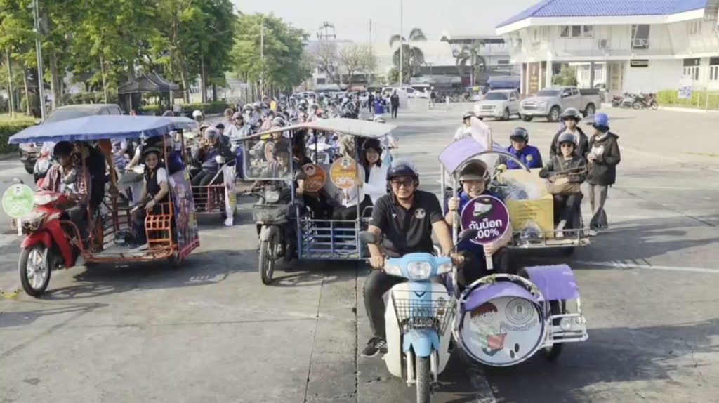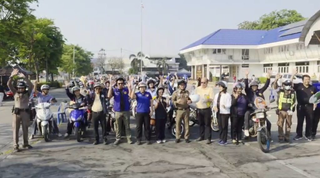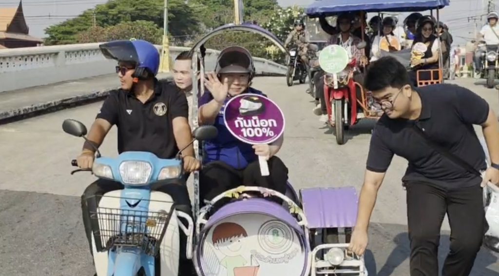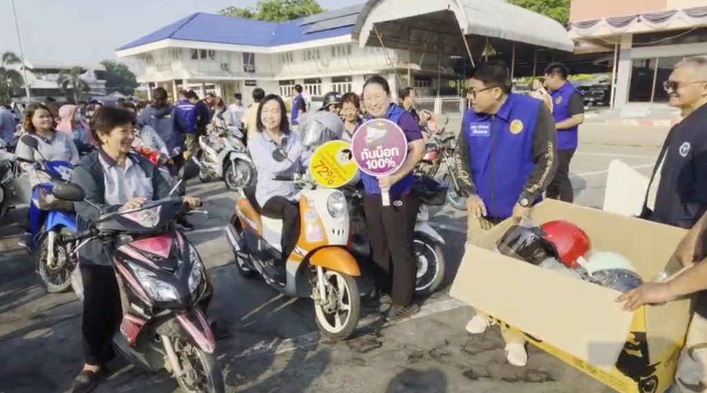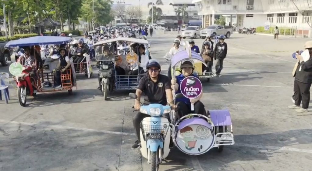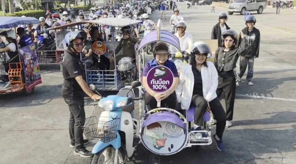 เมื่อนายอำเภอสาว ต้องนั่งซาเล้ง ไปรณรงค์ขับขี่ปลอดภัย แจกหมวกนิรภัย ช่วงลงเนินจะน่าเสียวแค่ไหน เจ้าหน้าที่ต้องรีบมาช่วยกันประคอง