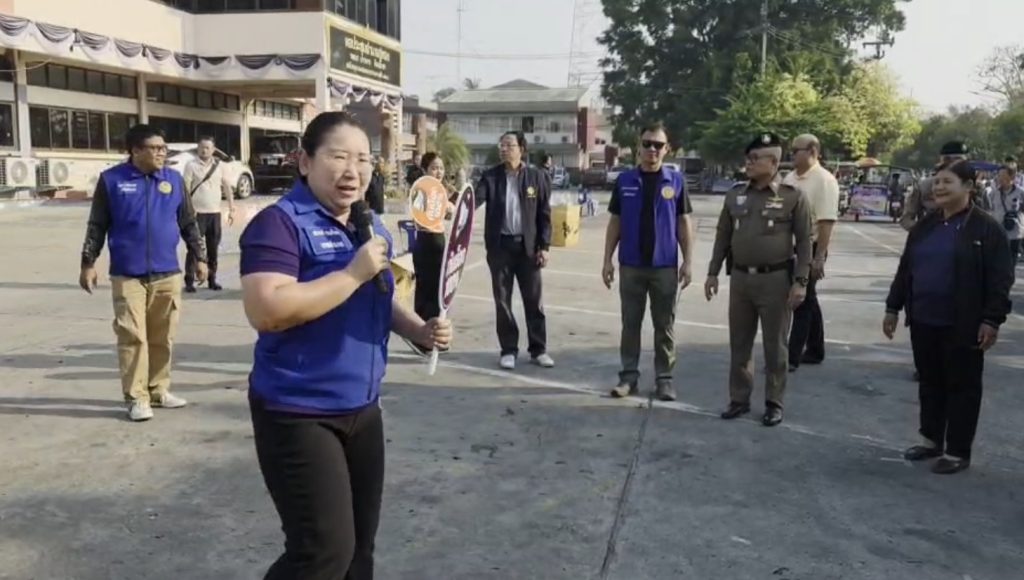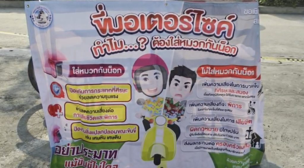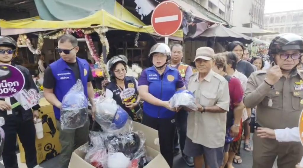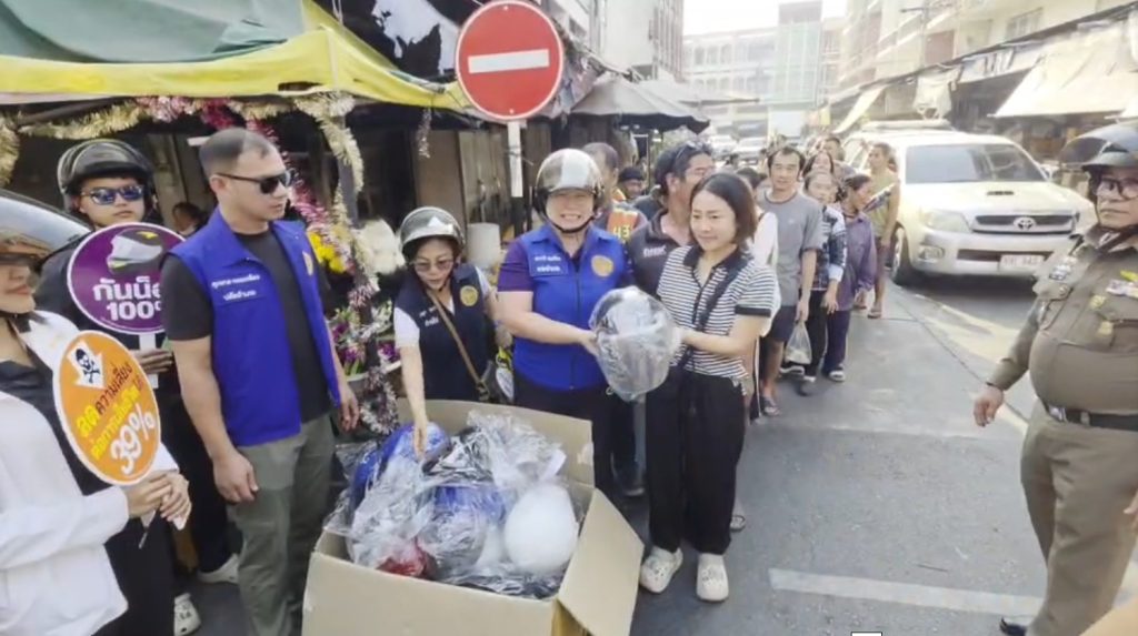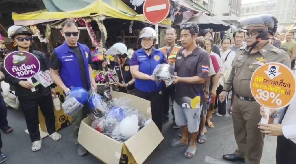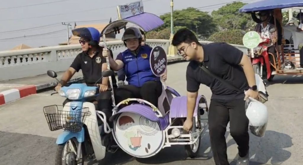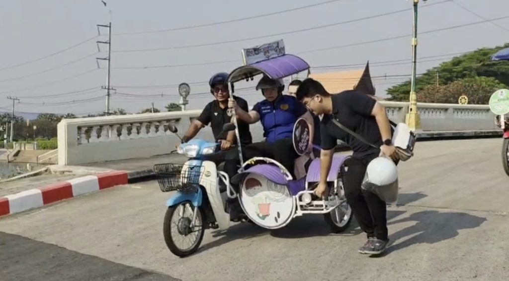 เมื่อนายอำเภอสาว ต้องนั่งซาเล้ง ไปรณรงค์ขับขี่ปลอดภัย แจกหมวกนิรภัย ช่วงลงเนินจะน่าเสียวแค่ไหน เจ้าหน้าที่ต้องรีบมาช่วยกันประคอง