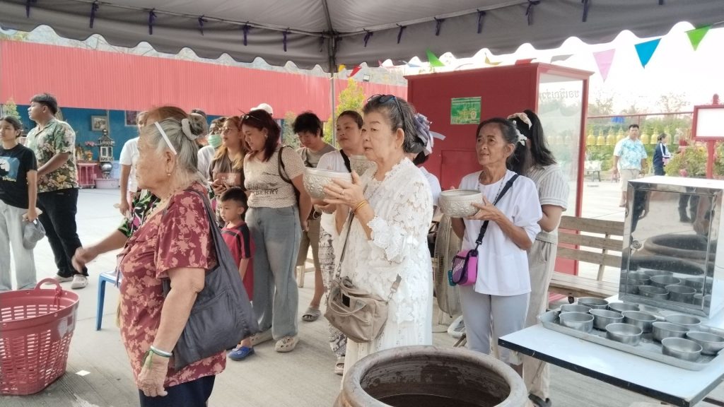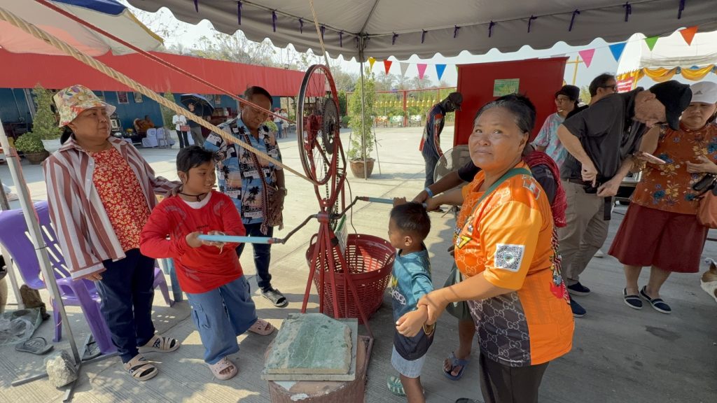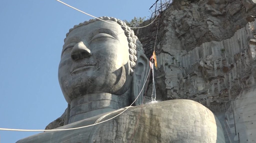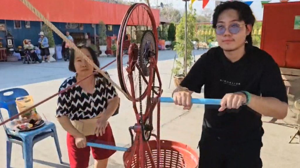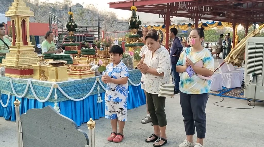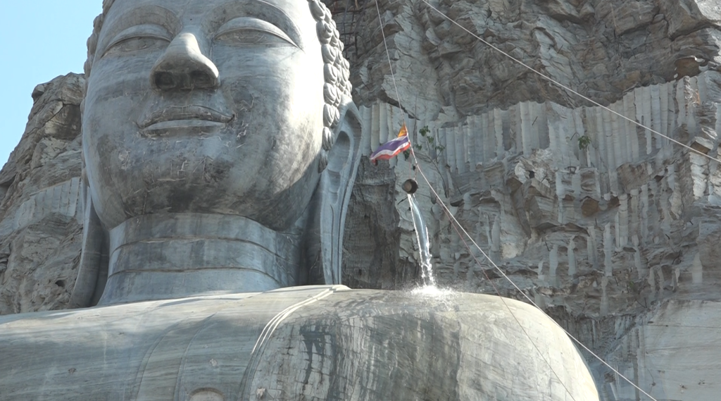 ประชาชนและนักท่องเที่ยว อธิฐานชักรอกนำถังน้ำขึ้นไปสรงน้ำพระพุทธปุษยคีรี (หรือหลวงพ่ออู่ทอง) พระแกะสลักหน้าผาใหญ่ที่สุดในโลก สูง 108 เมตร เทศกาลสงกรานต์หรือปีใหม่ไทย