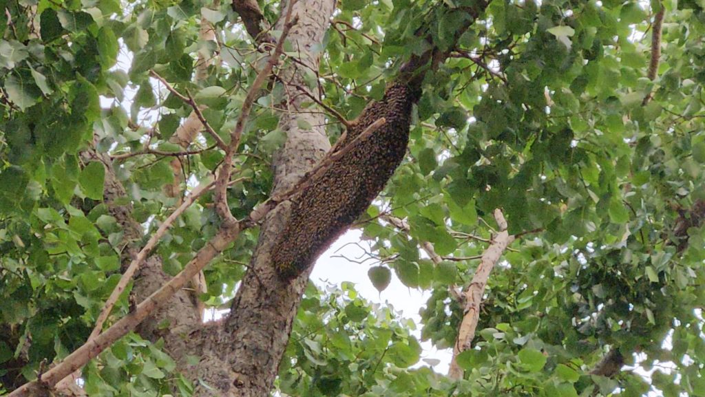 ด้านนายศราวุฒิ ดิชวงษ์ ผู้ใหญ่บ้าน ม.4 ต.ผึ้งรวง เล่าว่า มีผึ้งมาอาศัยอยู่บริเวณต้นโพธิ์ ภายในวัน เนื่องจากว่ามีการจัดงานประจำปีภายในวัด และได้มีแม่ค้าปลาหมึกมาย่างปลาหมึกขายใต้ต้นโพธิ์ ได้มีควันพุ่งไปทำให้ผึ้งแตกรัง ไล่ต่อยพระ ชาวบ้านและพ่อค้าแม่ค้า ภายในงาน วันนี้ก็ได้ได้แจ้งไปยังเจ้าหน้าที่กู้ภัยฯ และ อบต.ให้นำรถกระเช้าเข้ามา ช่วยกำจัดออกไปก่อน ซึ่งที่ผ่านมาผึ้งได้เข้ามาทำรังภายในวัดรอบนี้เป็นรอบที่ 3 แล้ว ซึ่งบริเวณต้นโพธิ์นี้เป็นรอบที่ 2 และต้นหลังวัด ก็เคยเข้ามาทำรัง และไล่ต่อย ครู และนักเรียน ซึ่งมีโรงเรียนอยู่ภายในวัด