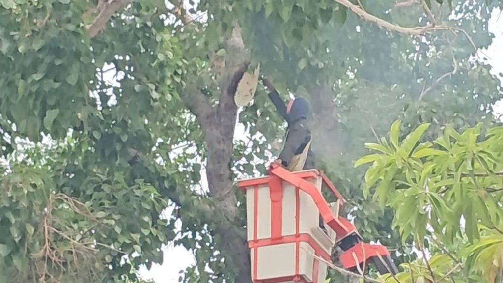 ในวันนี้ทางคณะกรรมการวัด พร้อมด้วยเจ้าหน้าที่ อบต. และผู้ใหญ่บ้าน ได้แจ้งไปยังเจ้าหน้าที่กู้ภัยฯ ให้ช่วยมากำจัดรังผึ้งหลวง เกรงว่าจะไล่ต่อยชาวบ้านอีกในคืนนี้ ซึ่งทางเจ้าหน้าที่ได้เตรียมรถกระเช้าเข้ามาเนื่องจากว่ารังของผึ้งอยู่ที่กิ่งโพธิ์ซึ่งสูงกว่าพื้นประมาณ 30 เมตร โดยก่อนการกำจัดรังผึ้งทางนายจำรัส พระวิจิตร รองนายก อบต.ผึ้งรวง ได้จุดธูปบอกกล่าวก่อน หลังจากนั้นเจ้าหน้าที่กู้ภัยฯ ได้นำกิ่งไม้ และใบไม้แห้ง และใบไม้สด มามัดรวมกัน เพื่อที่จะนำไปจุดไฟให้เกิดเป็นควันเพื่อไล่ผึ้ง และใช้ใบไม้ที่มีควันปาดเอาตัวผึ้งออก ก่อนที่จะใช้มีดปาดเอารังผึ้งลงมา โดยใช้เวลาไม่ถึง 10 นาทีก็สามารถกำจัดรังผึ้งหลวงได้สำเร็จ ซึ่งรังผึ้งยังไม่ใหญ่มากนัก คาดว่าผึ้งน่าจะเพิ่งเข้ามาทำรัง เนื่องจากว่าที่รังยังมีหัวน้ำหวานไม่มาก