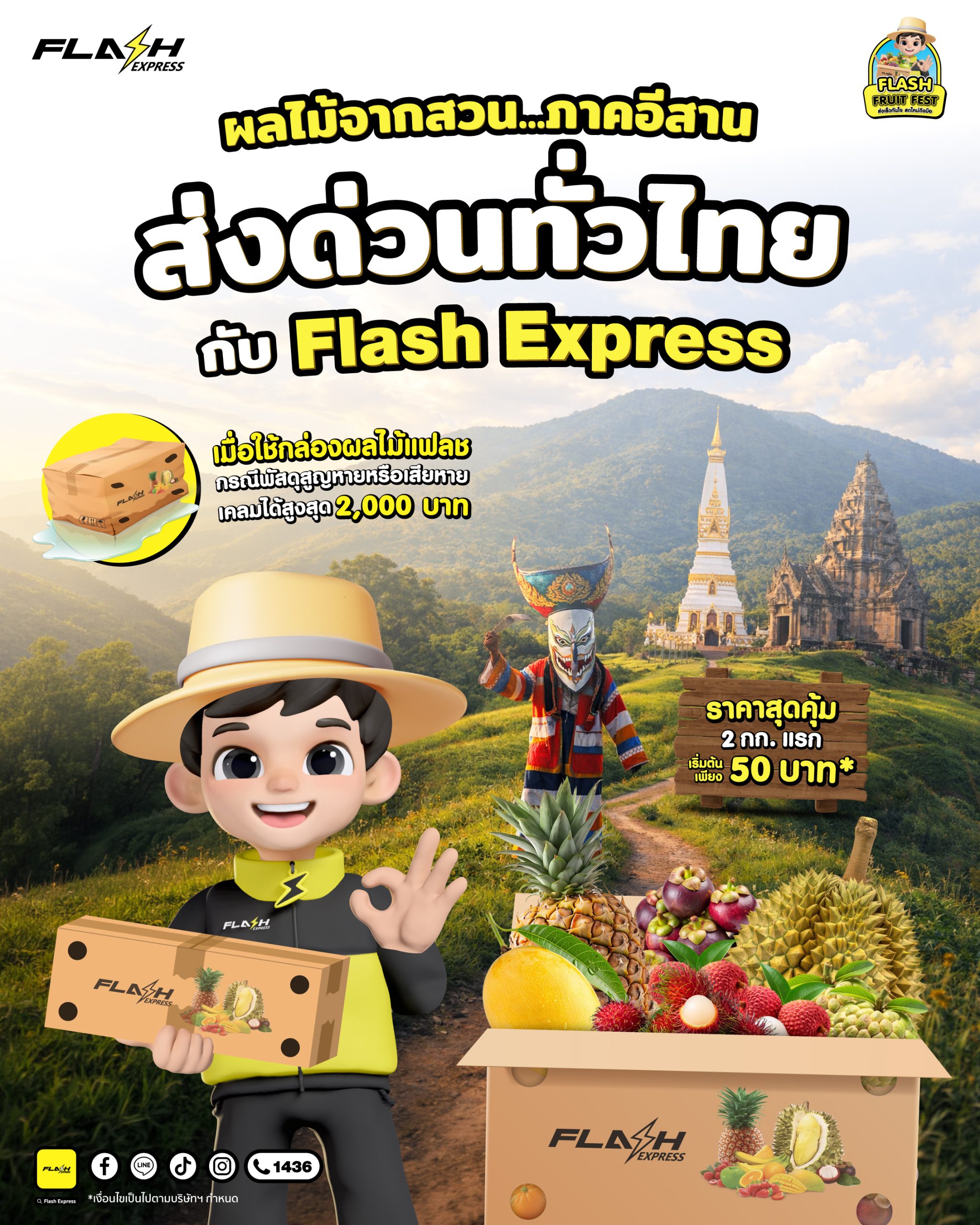 นอกจากนี้ ลูกค้ายังสามารถเลือกใช้กล่องผลไม้ Flash Express เพื่อคงความสดใหม่ ลดความบอบช้ำ กล่องหนา 5 ชั้น แข็งแรงทนทาน เสริมความปลอดภัยตลอดเส้นทาง ในราคาสุดคุ้ม 2 กิโลกรัมแรก เริ่มต้นเพียง 50 บาท พร้อมรับสิทธิ์เคลมกรณีพัสดุสูญหาย หรือเสียหาย สูงสุด 2,000 บาท เพื่อรองรับความสะดวกของลูกค้าในพื้นที่ภาคอีสาน แฟลชยังมี จุดให้บริการกว่า 5,000 จุด ครอบคลุมทั่วภูมิภาค ทั้งแฟลช ช็อป, แฟลช โฮม และร้านค้าพาร์ตเนอร์ชั้นนำทั่วประเทศ เช่น 7-Eleven, บริษัท โทรคมนาคมแห่งชาติ จำกัด (มหาชน) หรือ NT และ Living OS หรือสอบถามข้อมูลเพิ่มเติมได้ที่ Website : www.flashexpress.co.th เฟสบุ๊ก: Flash express ,Line: @flashexpressth หรือทาง App: Flash express และ Contact Center 1436